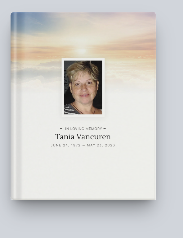 Surrounded by the love of family and friends, Tania Marie VanCuren was called home to God and took her rightful place amongst the angels on May 23, 2023. Her passing leaves an irreplaceable void in all the lives she touched. As an Organ Donor through her passing she was able to continue to give back and has saved two lives.